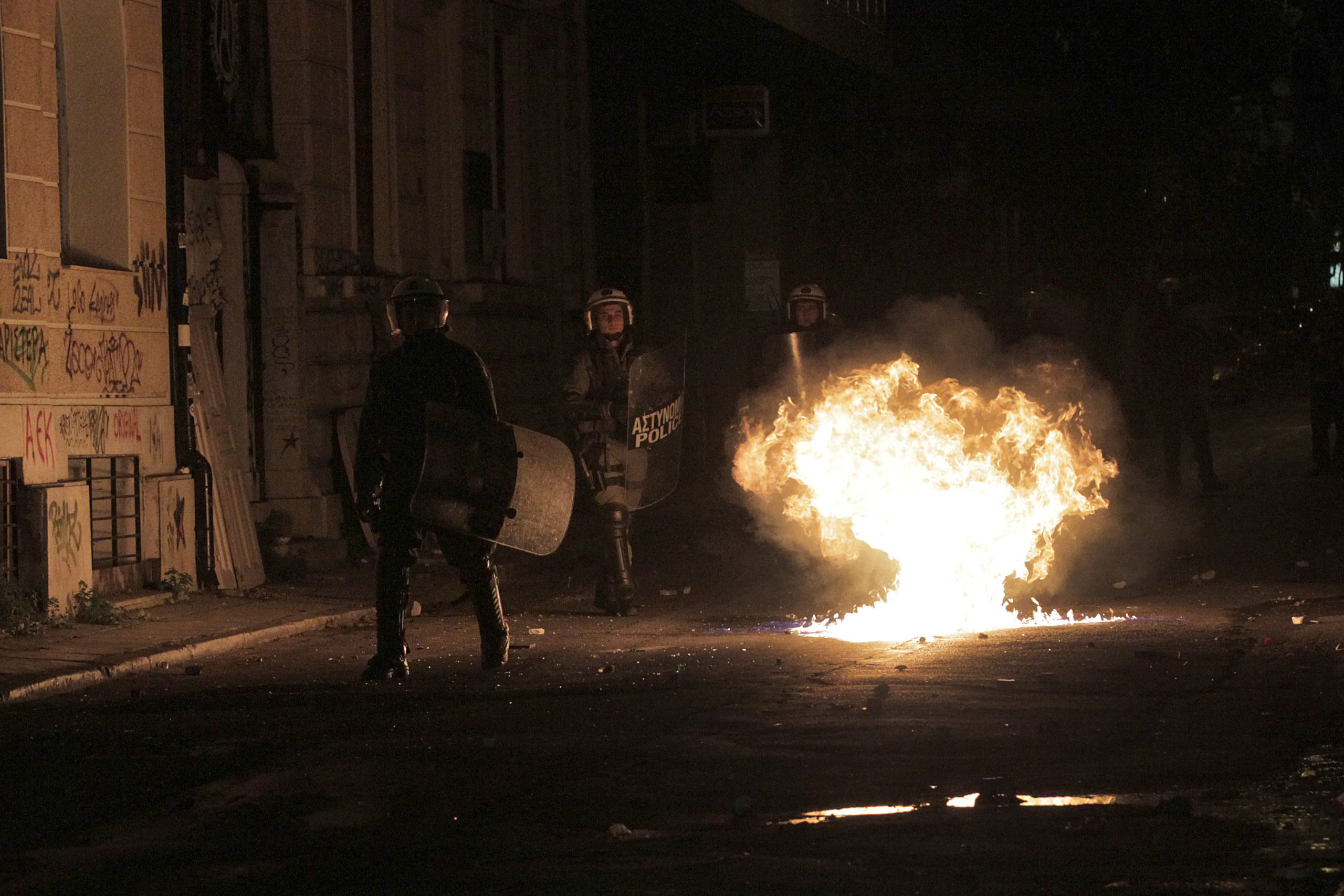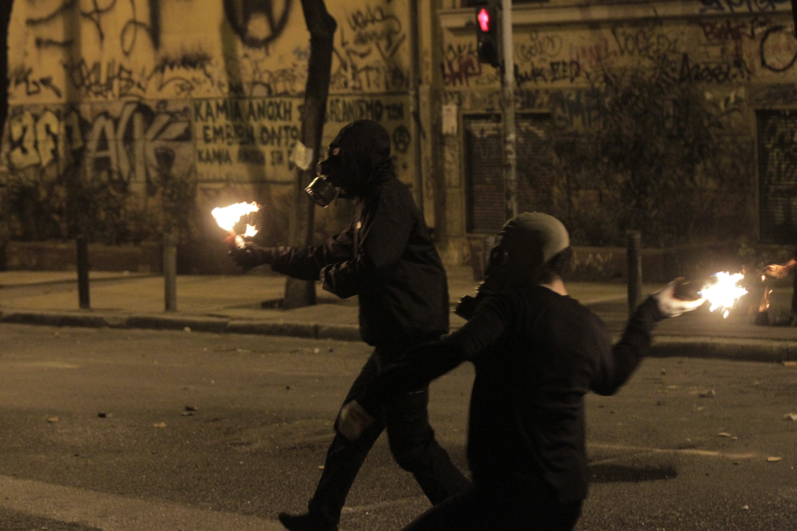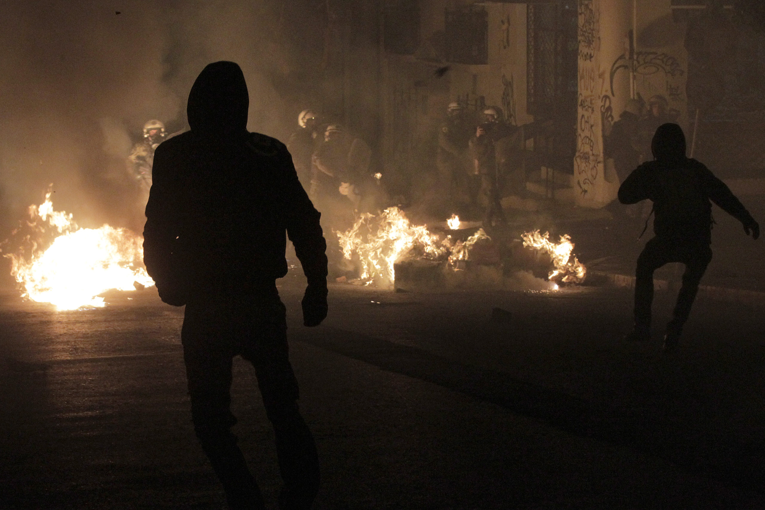 Οι αντιεξουσιαστές συνεχίζουν να ρίχνουν μολότοφ και πέτρες στις διμοιρίες των ΜΑΤ, αλλά και να βάζουν φωτιές σε κάδους απορριμμάτων, ενώ τις τελευταίες ώρες η περιοχή των Εξαρχείων θυμίζει «πεδίο μάχης».