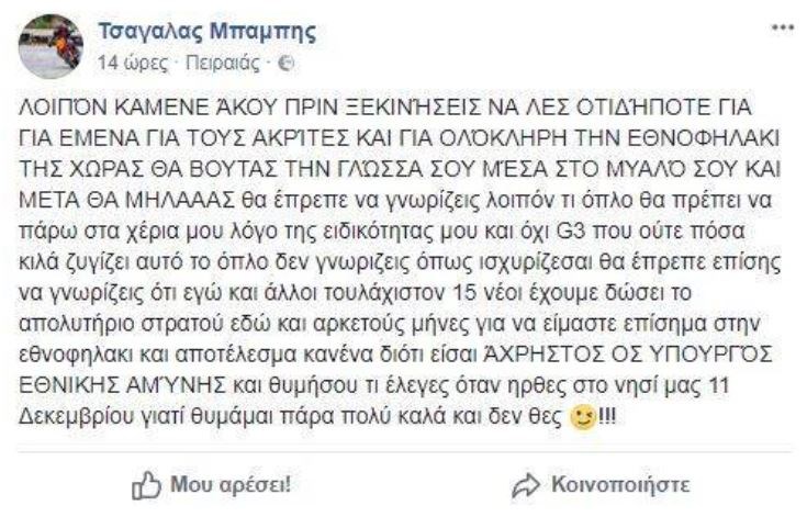 Ο Χαράλαμπος Τσαγαλάς σε ανάρτηση στον προσωπικό του λογαριασμό στο Facebook αναφέρει μεταξύ άλλων: “Πριν ξεκινήσεις να λες οτιδήποτε για εμένα, για τους ακρίτες και για ολόκληρη της εθνοφυλακή της χώρας θα βουτάς τη γλώσσα σου μέσα στο μυαλό σου και μετά θα μιλάς” και συνεχίζει: