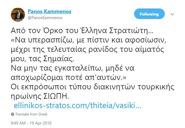 “Από τον Όρκο του Έλληνα Στρατιώτη…«Να υπερασπίζω, με πίστιν και αφοσίωσιν, μέχρι της τελευταίας ρανίδος του αίματός μου, τας Σημαίας. Να μην τας εγκαταλείπω, μηδέ να αποχωρίζομαι ποτέ απ’αυτών” έγραψε μεταξύ άλλων ο υπουργός Εθνικής Άμυνας.
