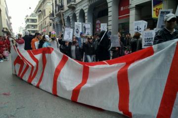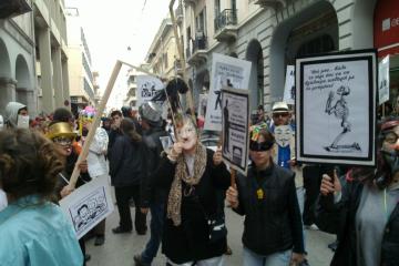 Οι αγανακτισμένοι προπορεύονται του καρναβαλιού της Πάτρας. Με ένα τεράστιο πανό που γράφει ”αντίσταση λαέ” βρίσκονται μπροστά από το άρμα του βασιλιά καρνάβαλου. Κρατούν πανο και πλακάτ με συνθήματα και κρεμάλες.