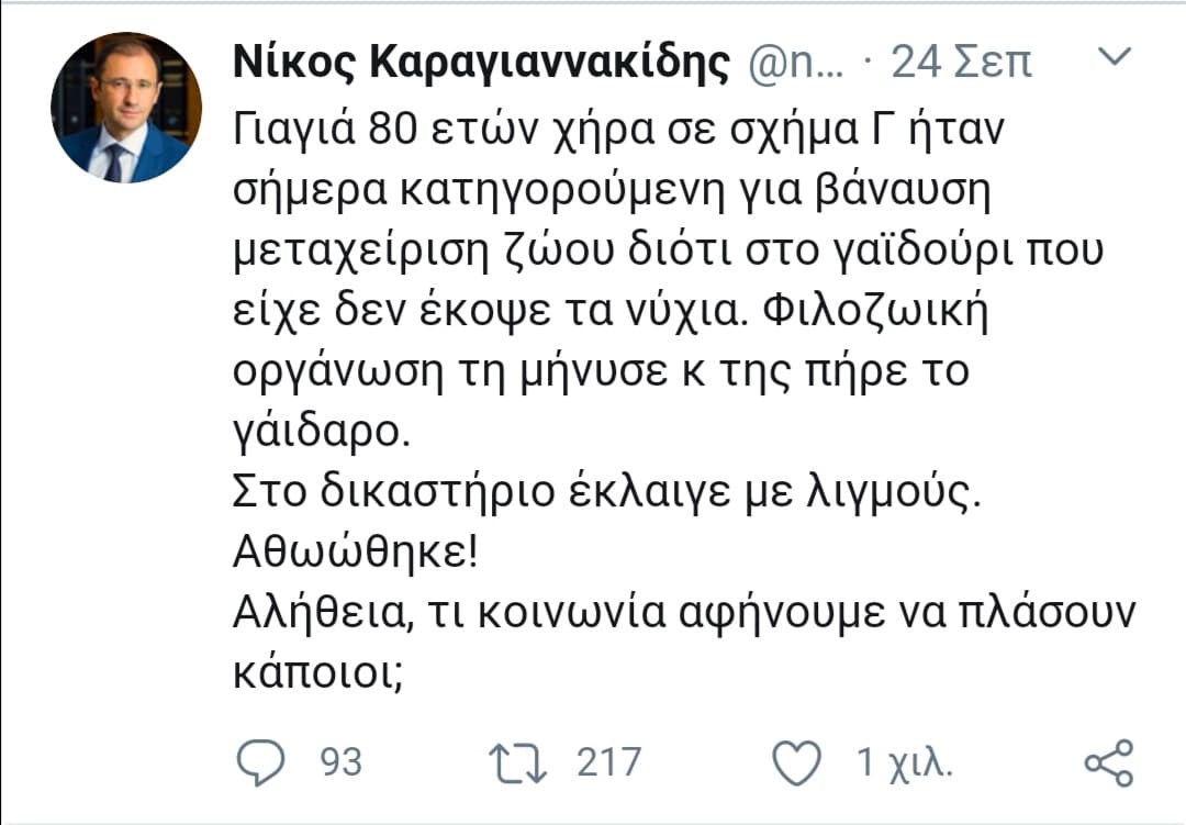 Το περιστατικό έκανε γνωστό με ανάρτηση του στο λογαριασμό του στα social ο δικηγόρος παρ’ Αρείω Πάγω Νικόλαος Καραγιαννακίδης: “Γιαγιά 80 ετών χήρα σε σχήμα Γ ήταν σήμερα κατηγορούμενη για βάναυση μεταχείριση ζώου διότι στο γαϊδούρι που είχε δεν έκοψε τα νύχια. Φιλοζωική οργάνωση τη μήνυσε κ της πήρε το γάιδαρο. Στο δικαστήριο έκλαιγε με λυγμούς. Αθωώθηκε! Αλήθεια, τι κοινωνία αφήνουμε να πλάσουν κάποιοι;”.