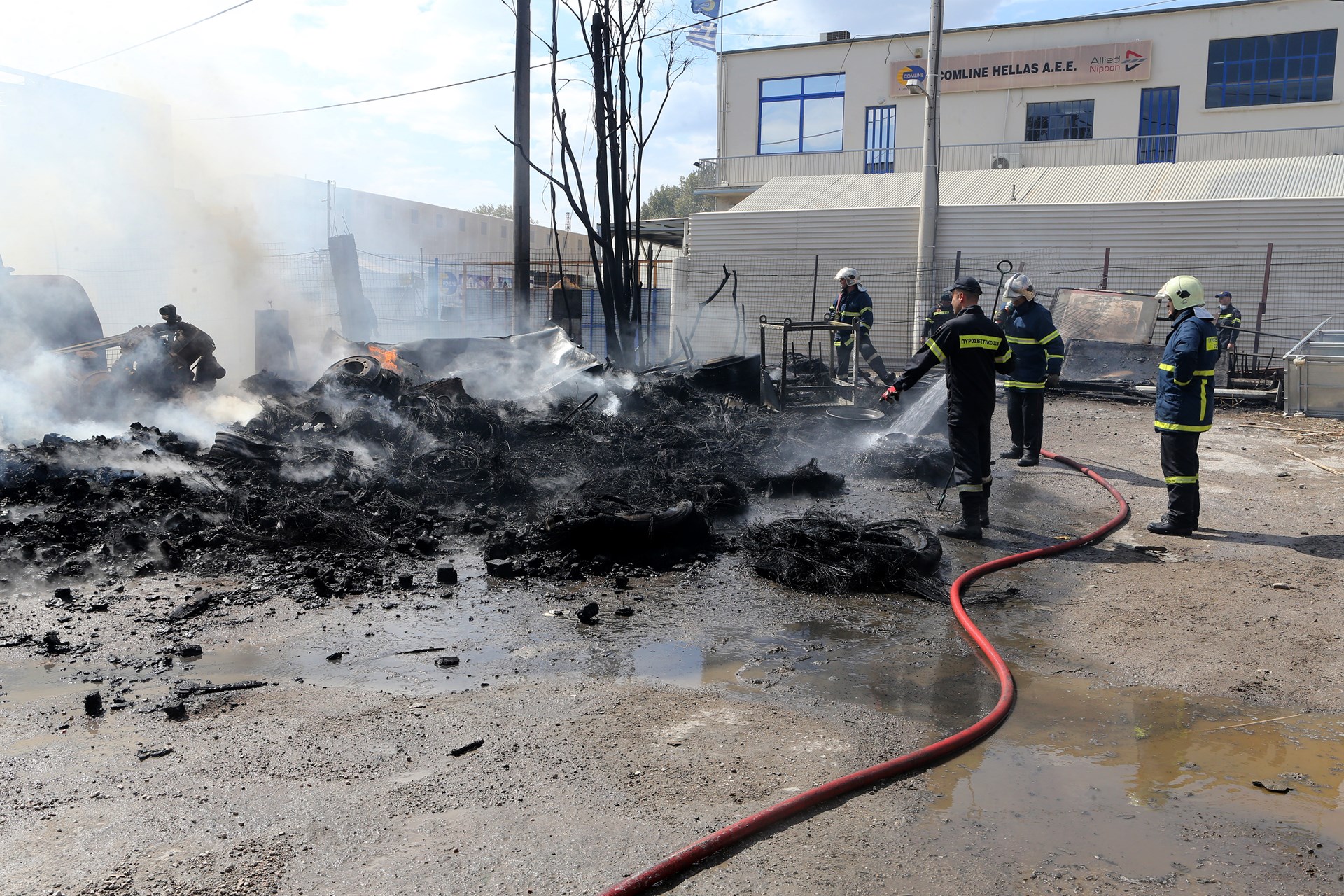 Λάστιχα και παλέτες που βρίσκονταν σε προαύλιο χώρο μεταφορικής εταιρείας στην οδό Αγίας Άννης στου Ρέντη έγιναν κάρβουνο, στη μεγάλη φωτιά που ξέσπασε το μεσημέρι.