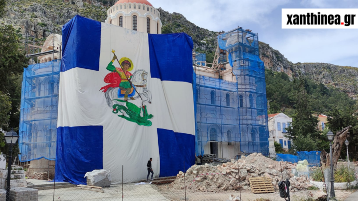 Μια τεράστια ελληνική σημαία με τον Άγιο Γεώργιο υψώθηκε στο Καστελλόριζο και αποτελεί το έργο του καλλιτέχνη από την Ξάνθη, Στράτου Μυλωνά, ο οποίος είναι ιδιαίτερα ταλαντούχος και γνωστός για το έργο του.