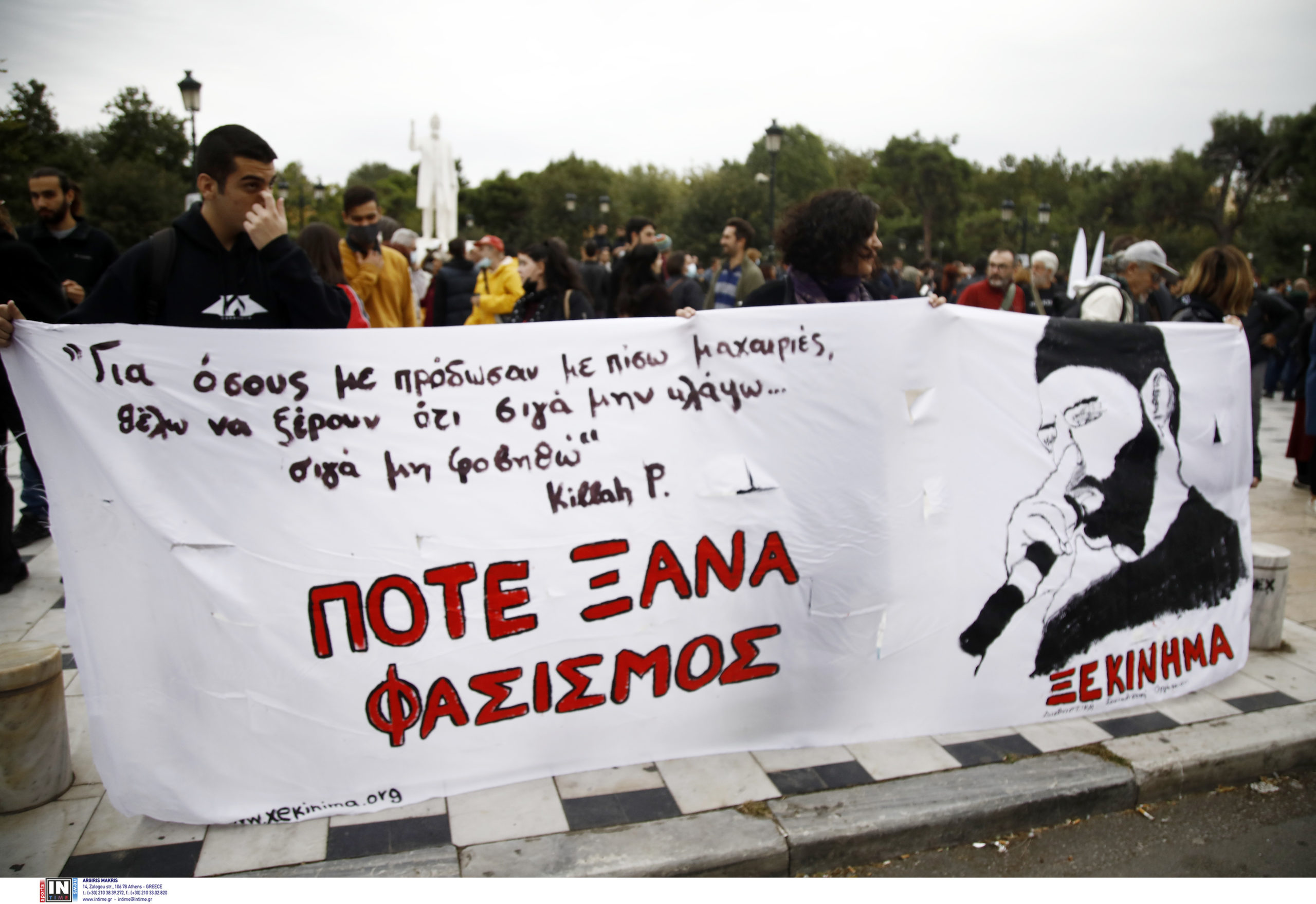 «Είστε η σαπίλα του ντουνιά, πολεμάμε τον φασισμό και το σύστημα που τον γεννά, ποτέ ξανά φασισμός», αναγράφουν μεταξύ άλλων τα πανό, ενώ, οι διαδηλωτές φωνάζουν δυνατά συνθήματα κατά της Χρυσής Αυγής.