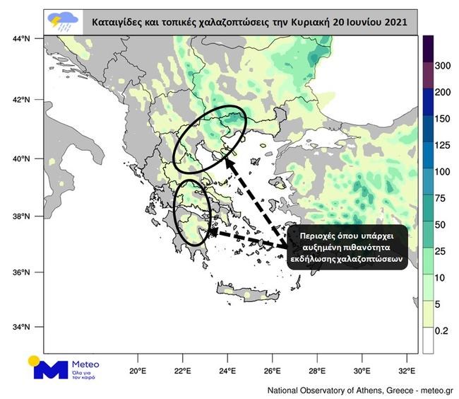 Στον προγνωστικό χάρτη που ακολουθεί παρουσιάζονται τα εκτιμώμενα αθροιστικά ύψη υετού (βροχές/καταιγίδες) έως τις βραδινές ώρες της Κυριακής 20/06, και επισημαίνονται οι περιοχές όπου εντοπίζεται η μεγαλύτερη πιθανότητα εκδήλωσης χαλαζοπτώσεων.