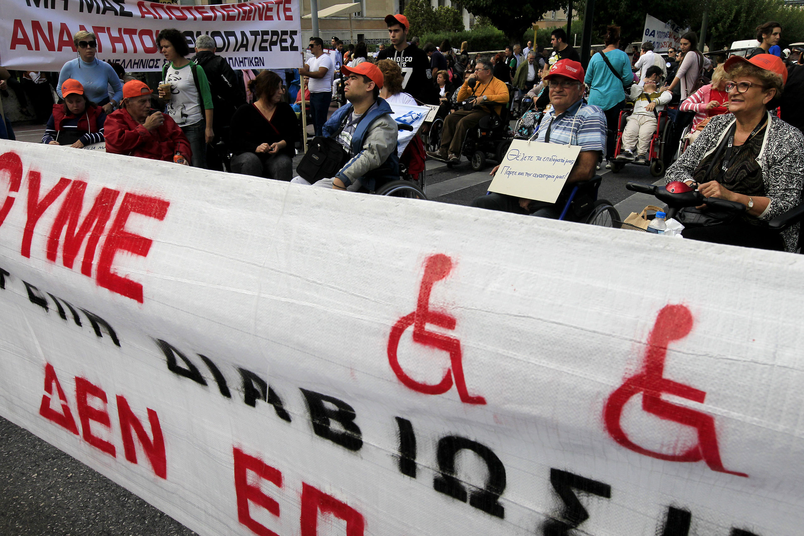 Την ίδια ώρα, πορεία προς τη Βουλή πραγματοποίησαν άτομα με αναπηρία και οι οικογένειές τους. «Τα μέτρα λιτότητας όμως που έχουν επιβληθεί αύξησαν δραματικά τη διαχρονική ανεργία και τη φτώχεια των ατόμων με αναπηρία.» επισημαίνουν, διεκδικώντας προστασία των δικαιωμάτων τους, κοινωνική ένταξη, αξιοπρεπή διαβίωση και κοινωνική προστασία.