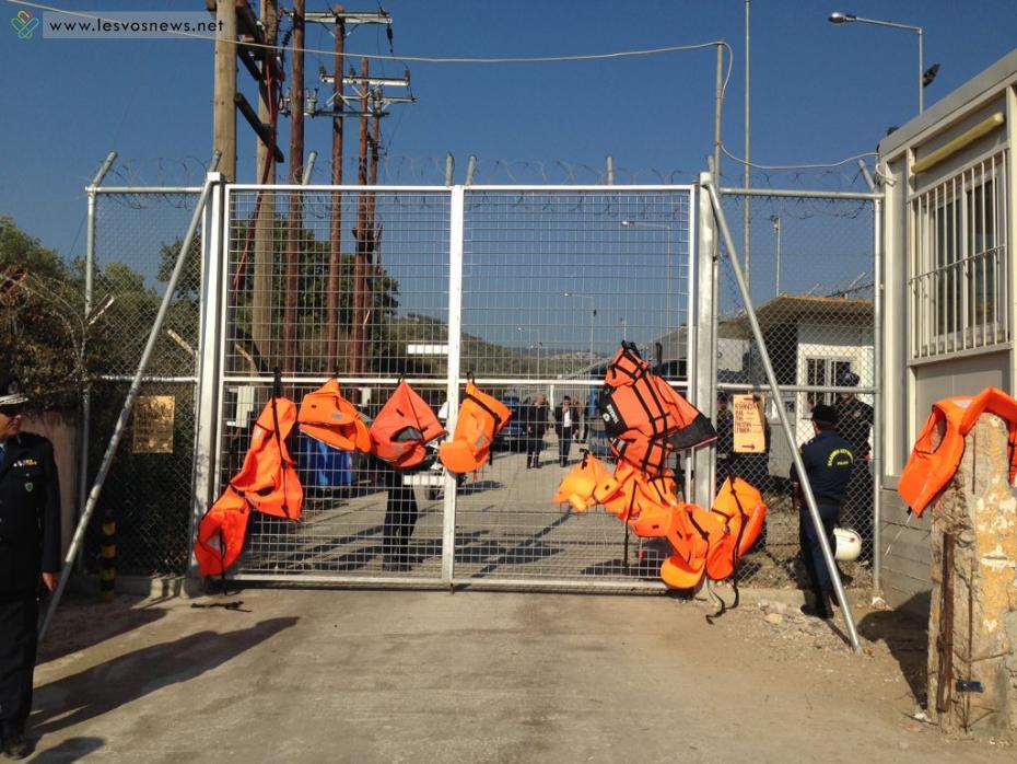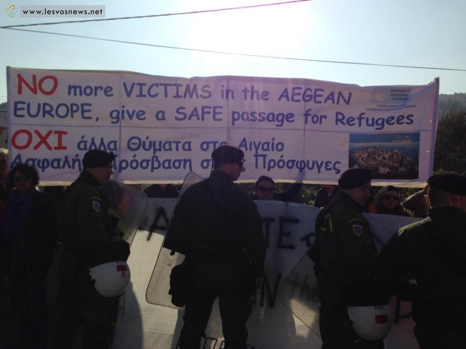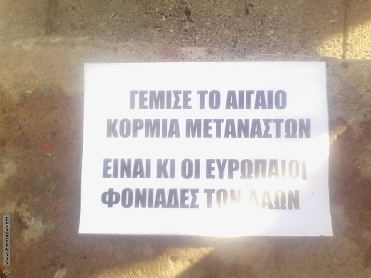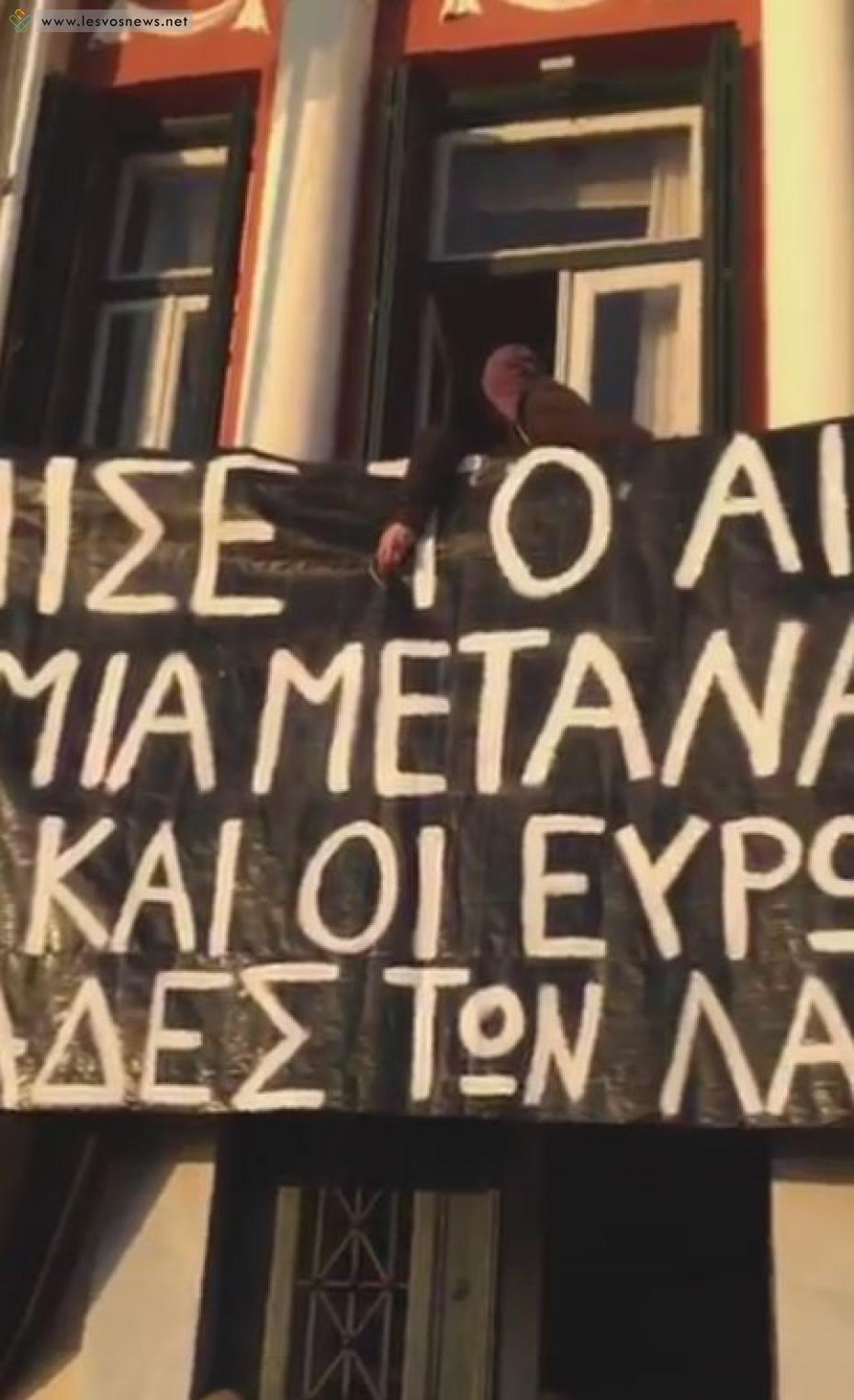 Διαδηλωτές στη Μυτιλήνη κατάφεραν σήμερα να αιφνιδιάσουν τις αστυνομικές δυνάμεις και να μπουν στο Παλαιό Δημαρχείο της πόλης και να υψώσουν ένα μαύρο πανό με το σύνθημα «Γέμισε το Αιγαίο κορμιά μεταναστών, είναι και οι Ευρωπαίοι φονιάδες των λαών».