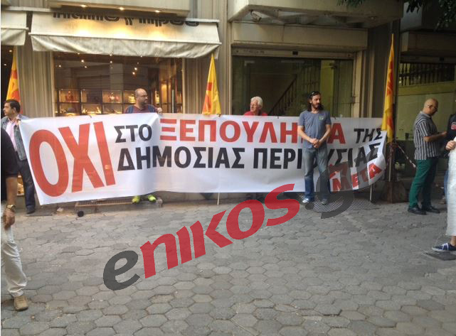 Σε συμβολικό αποκλεισμό της εισόδου του ΤΑΙΠΕΔ, έχουν προχωρήσει από νωρίς το πρωί, εργαζόμενοι του ΟΛΠ, ΟΛΘ, ΤΡΑΙΝΟΣΕ και έχουν αναρτήσει πανό τα οποία γράφουν «όχι στο ξεπούλημα της δημόσιας περιουσίας».