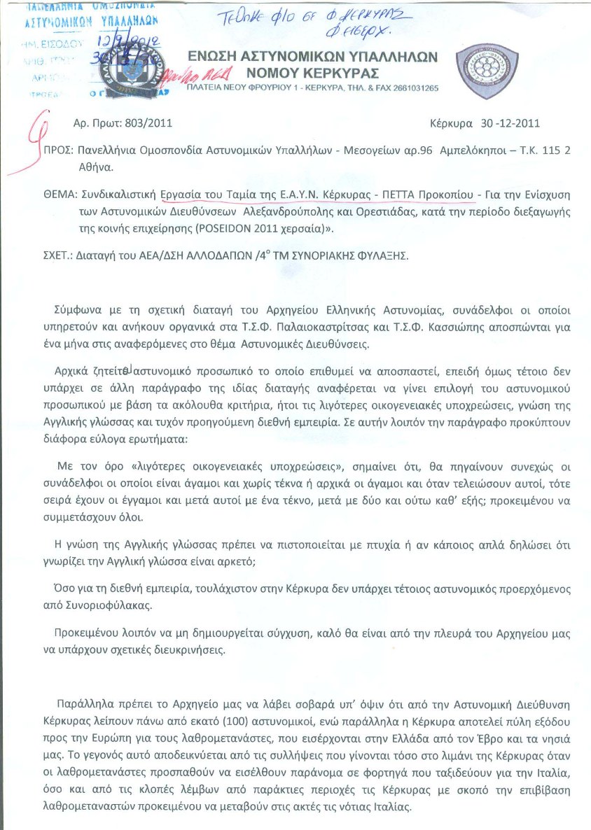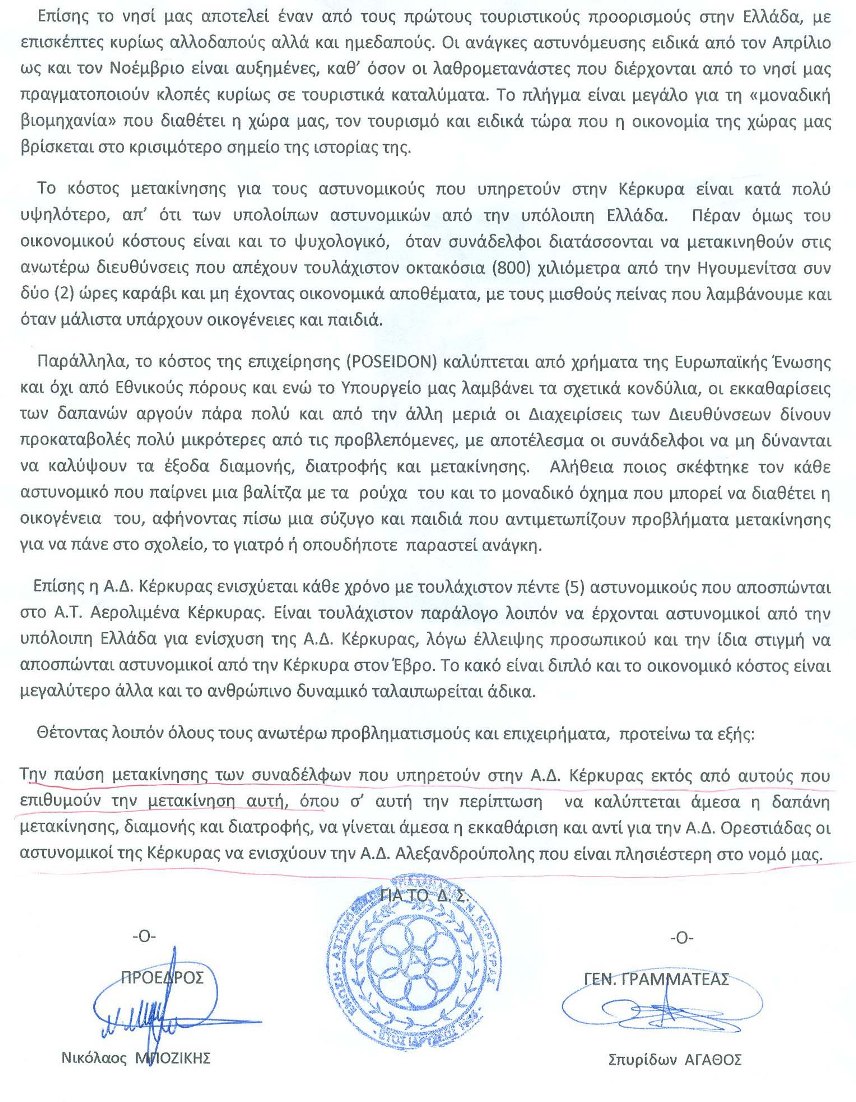 Αστυνομικοί από την Κέρκυρα, με μισθούς πείνας όπως καταγγέλουν, καλούνται να μετακινηθούν από την Κέρκυρα στον Έβρο (800 χ.λ.μ.) για να αντιμετωπίσουν τη λαθρομετανάστευση. Η αστυνομική δύναμη στην Κέρκυρα, σύμφωνα με την Πανελλήνια Ομοσπονδία Αστυνομικών Υπαλλήλων, αριθμεί περισσότερες από 100 κενές οργανικές θέσεις…