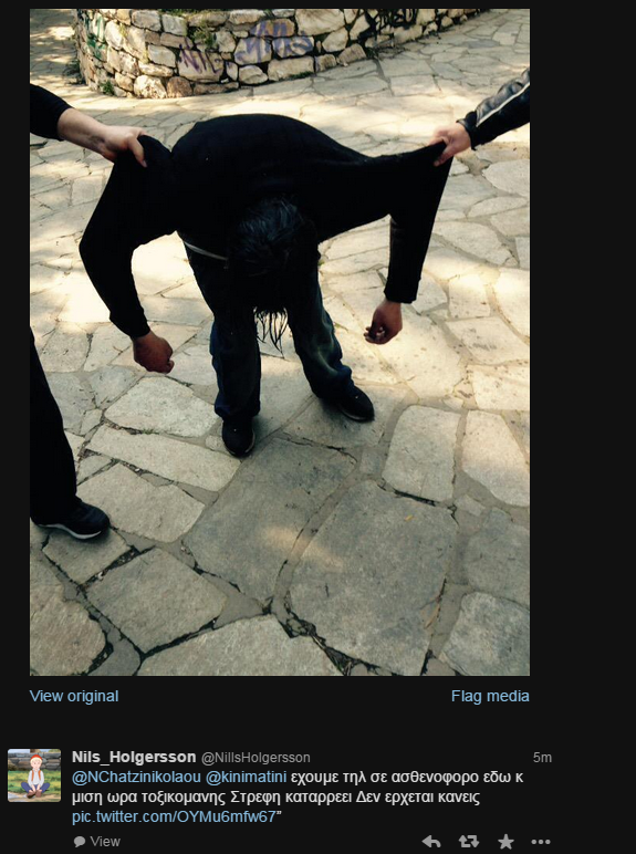 Χρήστες του twitter καταγγέλλουν ότι δεν υπάρχει ελεύθερο ασθενοφόρο προκειμένου να παραλάβει έναν νέο εξαρτημένο από τα ναρκωτικά , στο λόφο του Στρέφη, ο οποίος, όπως αναφέρουν, βρίσκεται σε άσχημη κατάσταση.