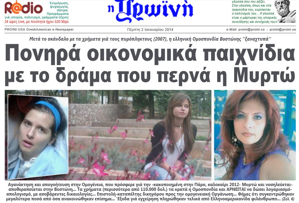 Σύμφωνα με την εφημερίδα, η ελληνική Ομοσπονδία Βοστώνης αρνείται να δώσει τα 110.000 δολάρια που συγκεντρώθηκαν από την ομογένεια για τη θεραπεία της Μυρτούς που νοσηλεύεται στη Βοστώνη και την υπόθεση ήδη εξετάζει δικηγόρος.