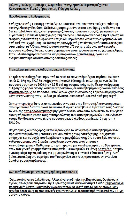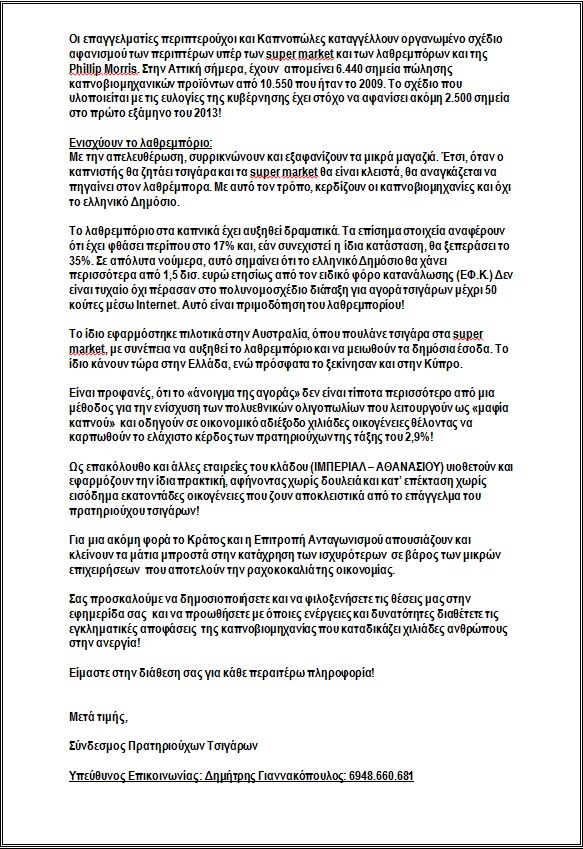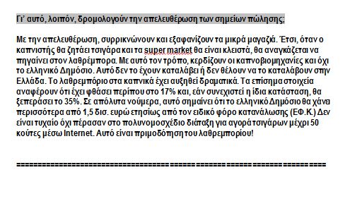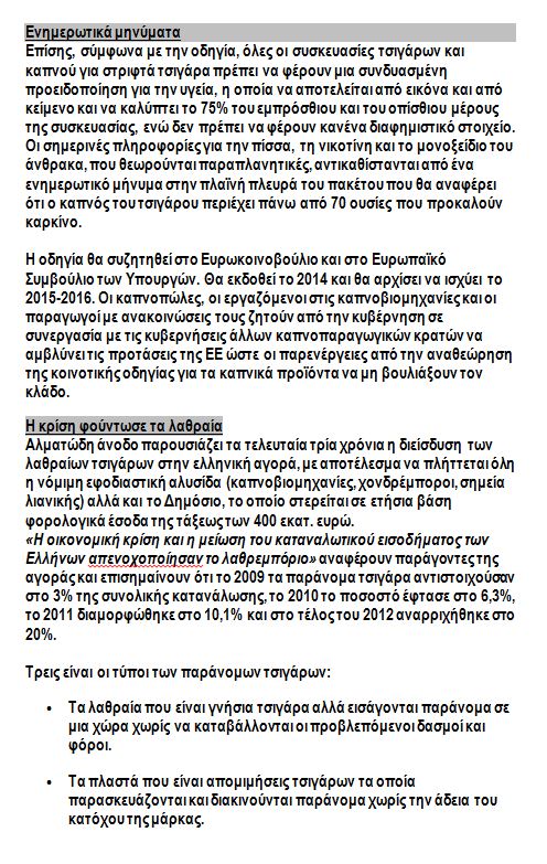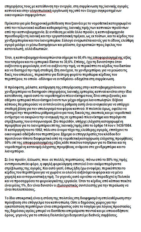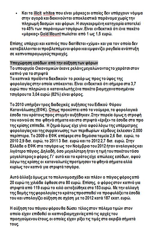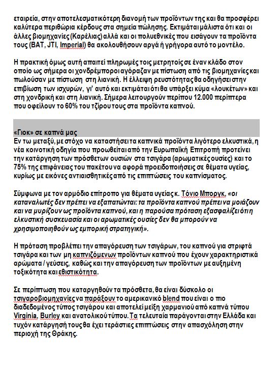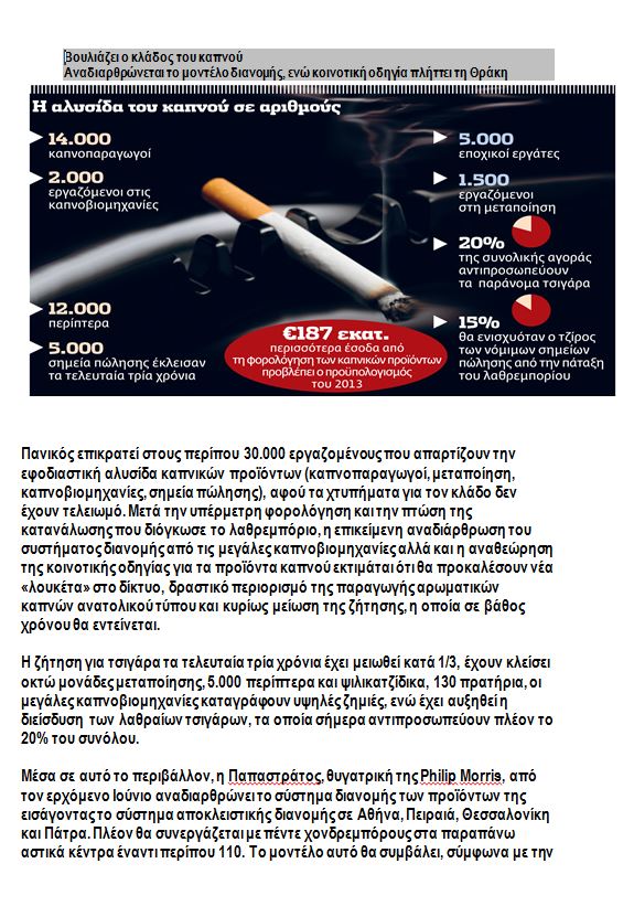 Στη συνέχεια, παραθέτουν ένα αναλυτικό ρεπορτάζ της εφημερίδας “Το βήμα”, από τις 20 Ιανουαρίου, στο οποίο περιγράφεται αναλυτικά η κατάσταση που επικρατεί στον κλάδο του καπνού.