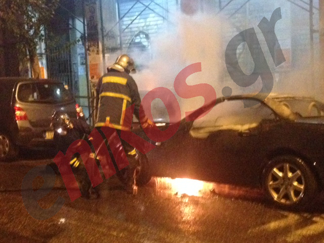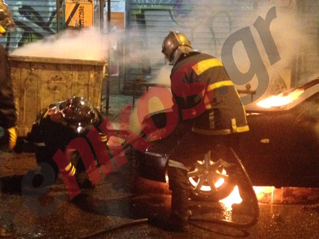 Πυροσβέστες επιχειρούν κατάσβεση στην οδό Χαριλάου Τρικούπη σε αυτοκίνητο που τυλίχθηκε, πριν από λίγη ώρα, μετά την πορεία των αντιεξουσιαστών στο κέντρο της Αθήνας.