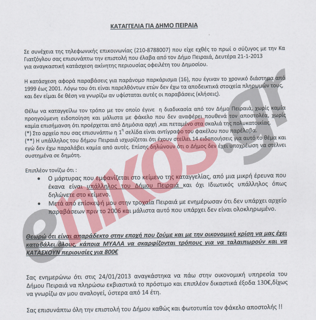 Οι κλήσεις αφορούν στο χρονικό διάστημα 1999-2001. Η καταγγέλουσα έχει κάνει ήδη ρύθμιση για το χρέος της προς το Δήμο Πειραιά, ωστόσο, όπως θα διαβάσετε στην επιστολή της, λέει ότι είναι απαράδεκτο στην εποχή που ζούμε κάποια μυαλά να σκαρφίζονται τρόπους για να ταλαιπωρούν και να κατάσχουν περιουσίες για 800 ευρώ.
