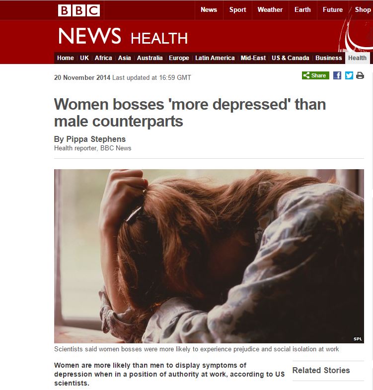 Έρευνες δείχνουν ότι οι γυναίκες που κατέχουν υψηλές θέσεις είναι πιο ευάλωτες στην κατάθλιψη από τους άνδρες καθώς δυσκολεύονται να διαχειριστούν ειδικές καταστάσεις στον χώρο εργασίας.