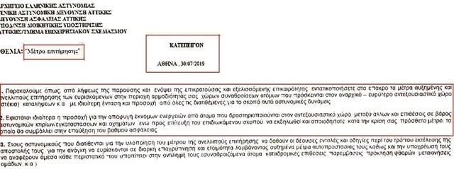 «Να εντατικοποιήσετε τα μέτρα αυξημένης και ανελλιπούς επιτήρησης χώρων(στέκια, καταλήψεις) όπου συναθροίζονται άτομα του αντιεξουσιαστικού χώρου με ιδιαίτερη προσοχή και ένταση. Εφιστάται ιδιαίτερα η προσοχή για την αποφυγή έκνομων ενεργειών από άτομα που δραστηριοποιούνται στον αντιεξουσιαστικό χώρο, μεταξύ άλλων επιθέσεις σε βάρος αστυνομικών κτιρίων, εγκαταστάσεων και οχημάτων, ενώ προς επίτευξη του σκοπού αυτού να εκδηλωθεί και οποιοδήποτε, κατά την κρίση σας, έκτακτο μέτρο για την επαύξηση του βαθμού ασφαλείας», σημειώνεται χαρακτηριστικά.