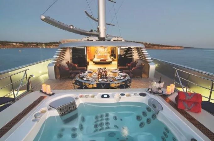 Το εξωτερικό έχει ξύλινα καταστρώματα, λουστραρισμένες κουπαστές και εξαίσια φινιρισμένες επιφάνειες. Στο εσωτερικό του σκάφους ξεχωρίζει το αίθριο, όπου ενώνονται τα τρία καταστρώματα του πλοίου με τη βοήθεια μιας κυκλικής σκάλας που περιβάλλει το κεντρικό κατάρτι. Μεταξύ άλλων το σκάφος διαθέτει γυμναστήριο, home cinema, jet ski.