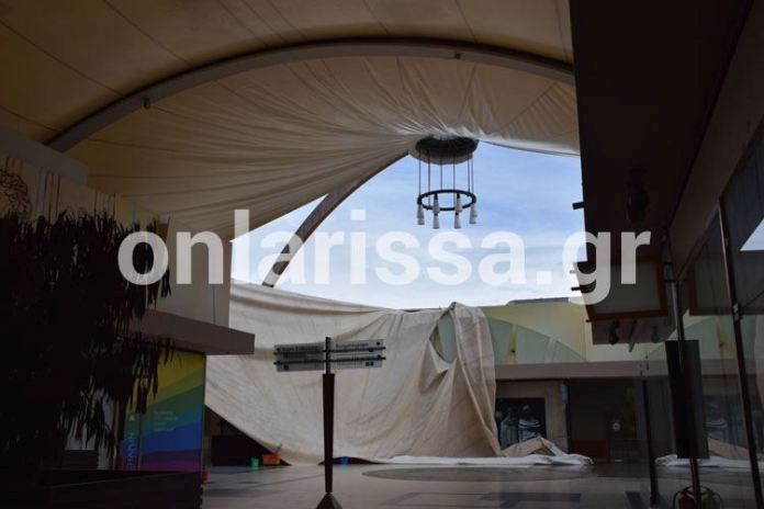 Η έντονη χιονόπτωση που έπληξε τη Λάρισα τις τελευταίες ημέρες, είχε ως αποτέλεσμα να καταρρεύσει η οροφή του εμπορικού κέντρου Pantheon Plaza.