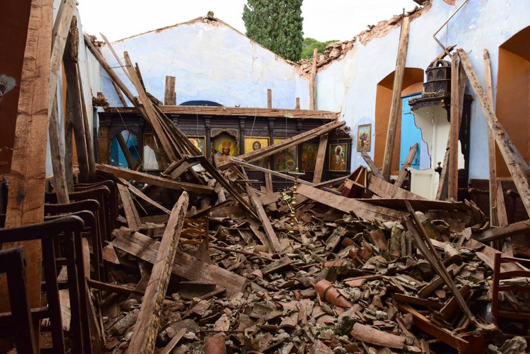Κατέρρευσε η στέγη και μέρος του βορείου τοίχου, με αποτέλεσμα να προκληθούν πολλές υλικές ζημιές εντός του Ναού.