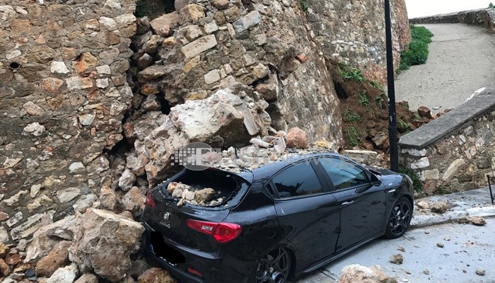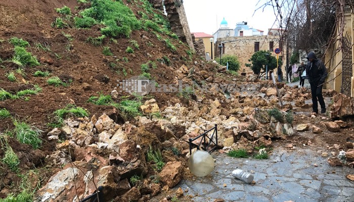 Μεγάλο τμήμα του βενετσιάνικου επιπρομαχώνα του Αγίου Δημητρίου κατέρρευσε σήμερα το μεσημέρι, στην δυτική πλευρά της παλιάς πόλης των Χανίων, εξαιτίας των έντονων βροχοπτώσεων.