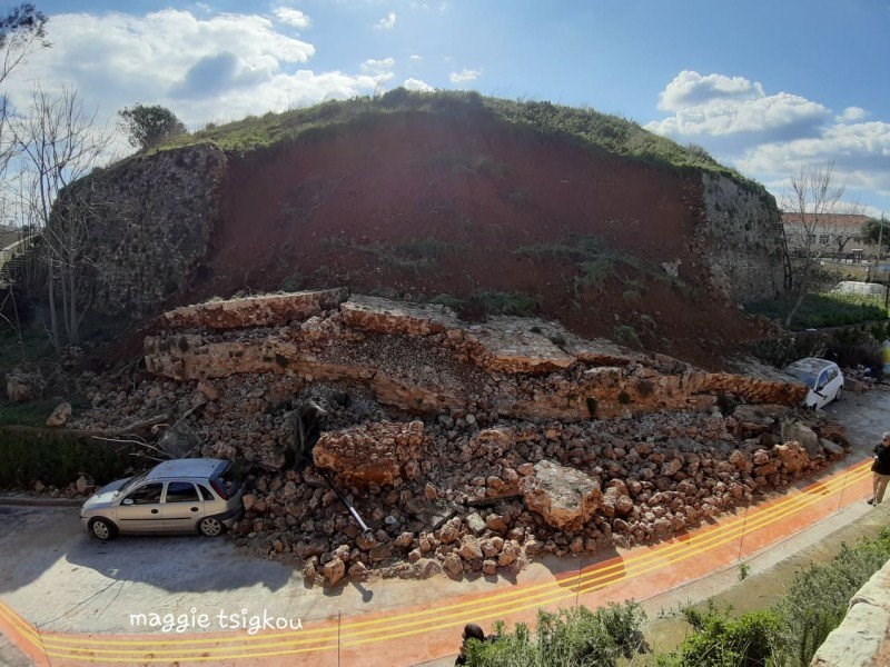Δύο ημέρες μετά την κατάρρευση μικρού τμήματος στο μνημείο του Επιπρομαχώνα του Αγ. Δημητρίου στην παλιά πόλη των Χανίων, τα ξημερώματα της Πέμπτης κατέρρευσε το βόρειο τμήμα του μνημείου, ενώ μεγάλοι χωμάτινοι όγκοι και πέτρες έπεσαν πάνω σε τρία σταθμευμένα αυτοκίνητα, προκαλώντας εκτεταμένες ζημιές.