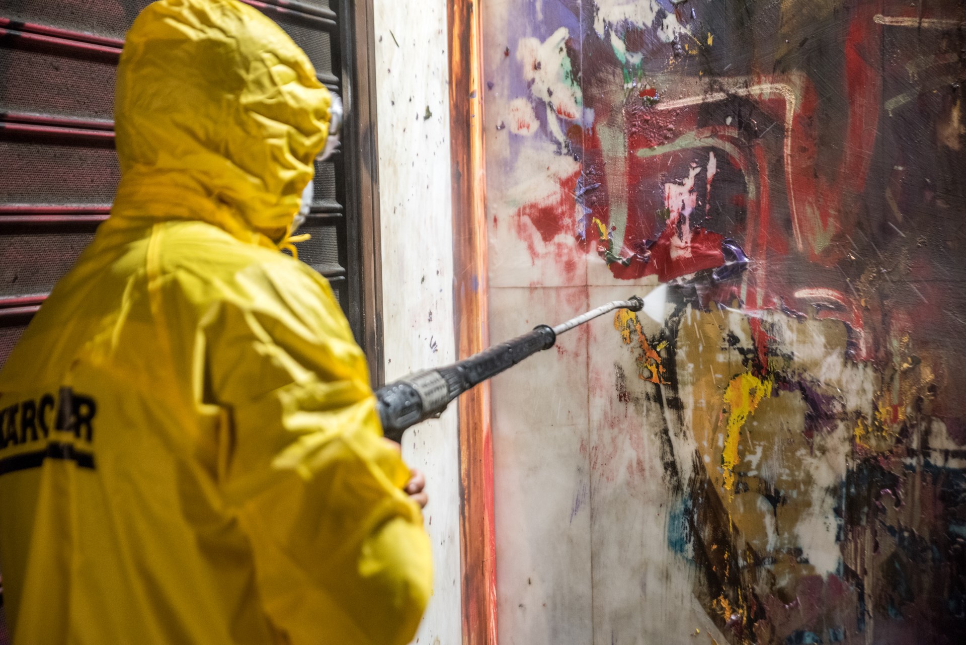 Η εντυπωσιακή σε μέγεθος παρέμβαση ξεκίνησε στις 16 Ιουνίου και καλύπτει την Πατησίων από την Ομόνοια μέχρι το ύψος της Λεωφόρου Αλεξάνδρας και στις δύο πλευρές της. Υπολογίζεται ότι θα καθαριστεί σταδιακά και μέχρι τα τέλη Ιουλίου ένα σύνολο επιφανειών μήκους περίπου ενός χιλιομέτρου και ύψους 3,5 μέτρων.