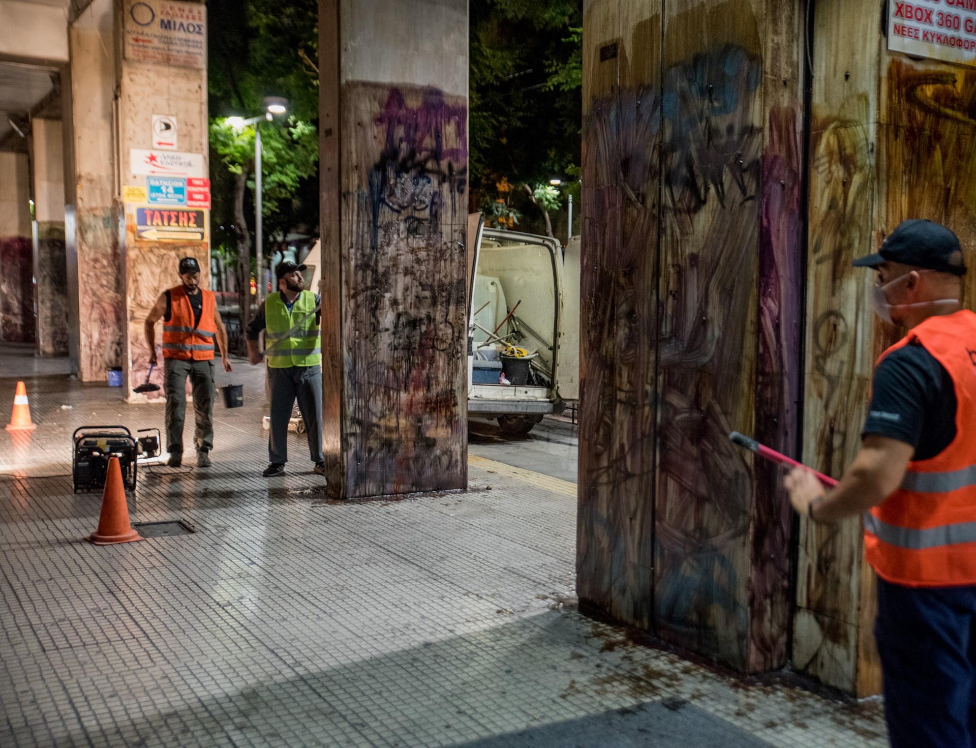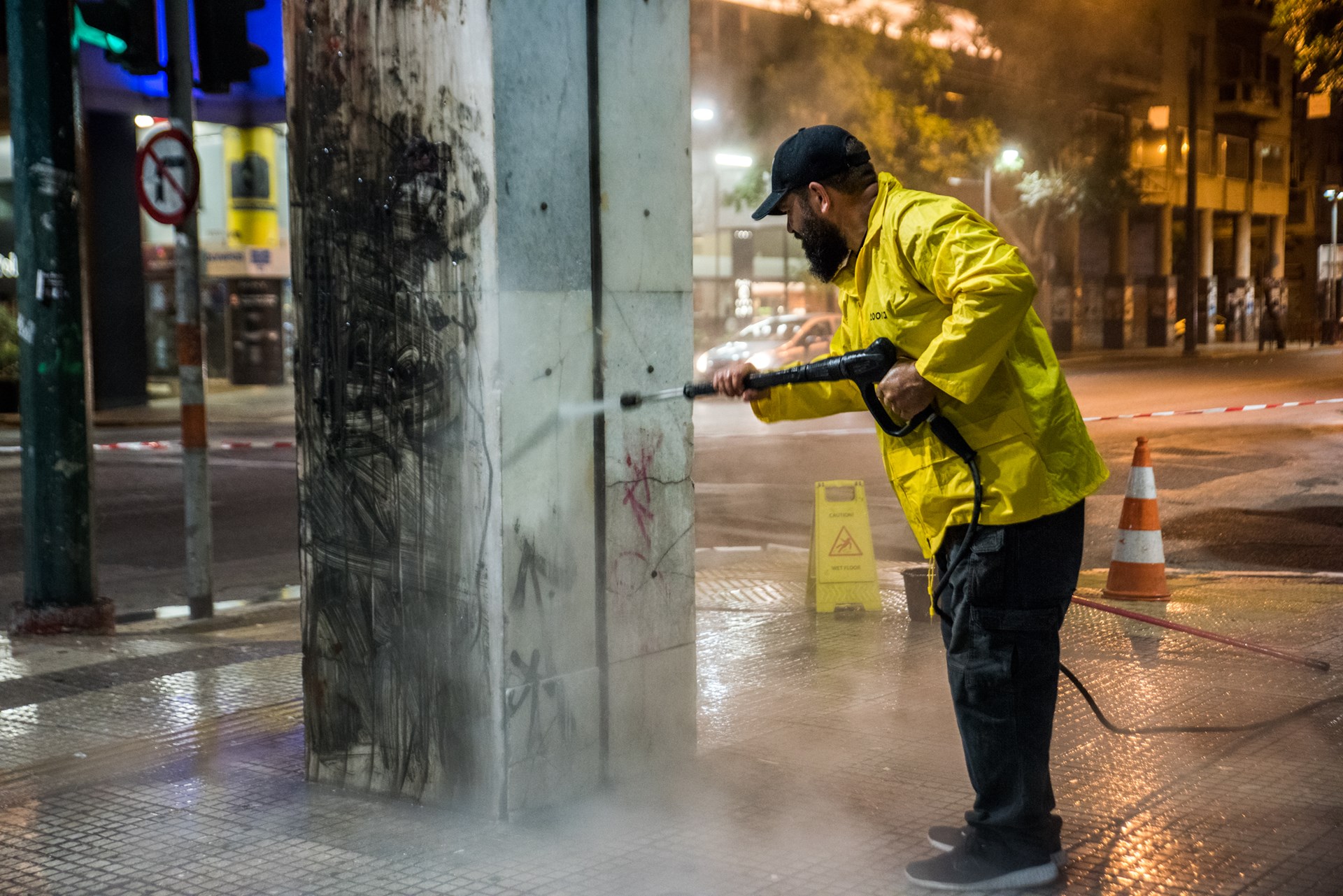 Οι εργασίες πραγματοποιούνται από ειδικά συνεργεία τα οποία προχωρούν στον καθαρισμό με πλυστικά μηχανήματα πίεσης ζεστού-κρύου νερού αλλά και στην τοποθέτηση ειδικού υλικού anti-graffiti και υδρόφοβης μπογιάς. Υλικά τα οποία αποτρέπουν την επανατοποθέτηση αφίσας και διευκολύνουν τον καθαρισμό νέας ρύπανσης που μπορεί να γίνει με μπογιές και κάθε άλλο τρόπο. Ο καθαρισμός γίνεται σε μάρμαρα, ρολά καταστημάτων, τοιχοποιίες και ΚΑΦΑΟ. Ενώ και τα πεζοδρόμια απολυμαίνονται με ειδικό υλικό και καυτό νερό 90 βαθμών και πίεσης 500 bars.