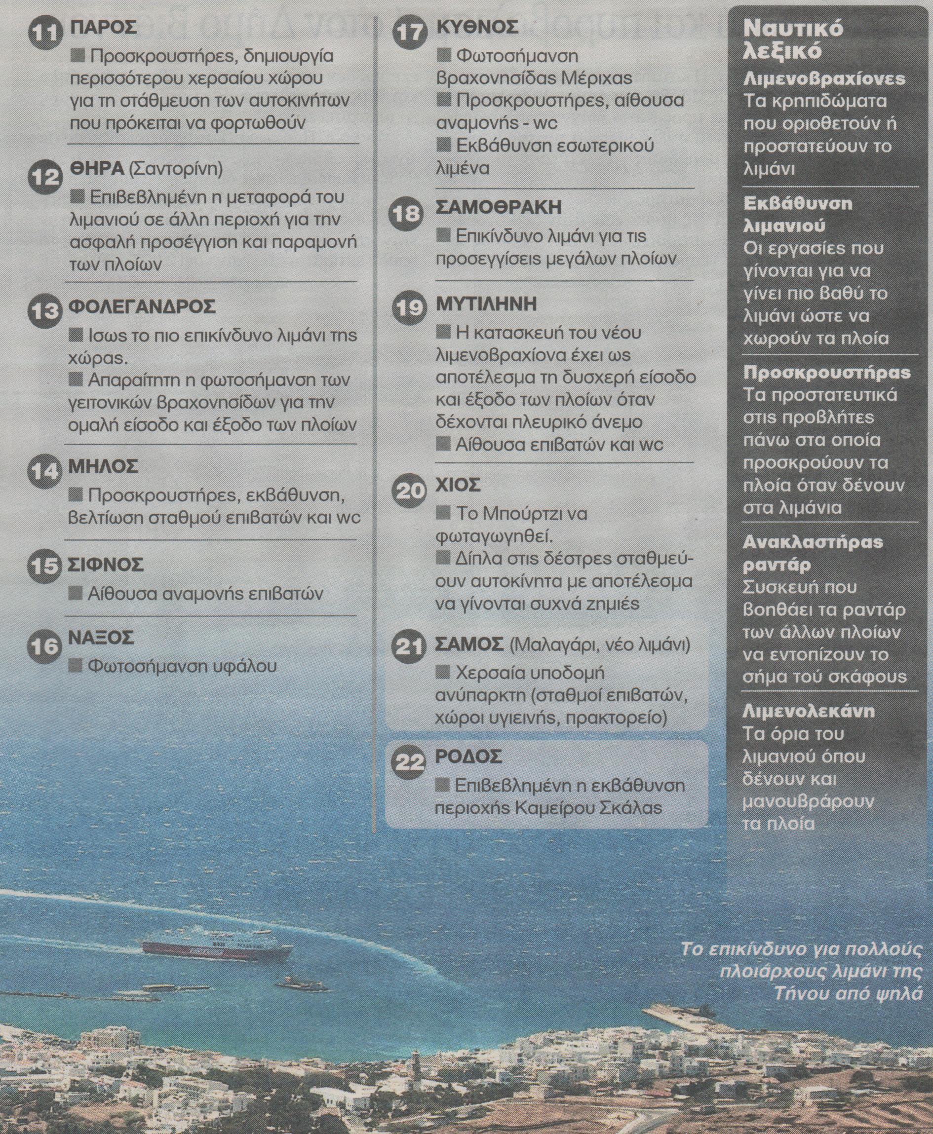 Ανεπαρκή και επικίνδυνα χαρακτηρίζουν τα περισσότερα λιμάνια οι πλοίαρχοι. Οπως λένε, στην ουσία πρόκειται για φυσικά αγκυροβόλια, που δημιουργήθηκαν στις αρχές του περασμένου αιώνα για να δέχονται καϊκια και πλέον -στην πλειονότητά τους- δεν πληρούν τις προϋποθέσεις για να δεχτούν πλοία 140 μέτρων, αλλά και ακόμη μεγαλύτερων.Η ανεπαρκής προστασία από τους ανέμους, τα αβαθή νερά που εμποδίζουν τους ελιγμούς, η ελλιπής σήμανση, αλλά και η έλλειψη προσκρουστήρων -για να μη χτυπούν τα πλοία πάνω στις προβλήτες- είναι τα σημαντικότερα προβλήματα που αντιμετωπίζουν τα ελληνικά λιμάνια, σύμφωνα με την έκθεση που συνέταξε για το 2012 η Πανελλήνια Ενωση Πλοιάρχων Εμπορικού Ναυτικού.