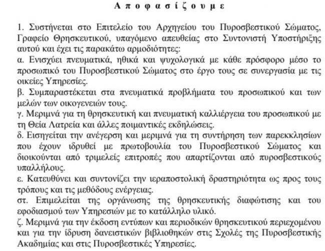 Θρησκευτική υπηρεσία αποκτά η Πυροσβεστική, σύμφωνα με ΦΕΚ που δημοσιεύτηκε στις 24 Ιανουαρίου με την υπογραφή του αρχηγού του Π.Σ , αντιστράτηγου Βασίλειου Ματθαιόπουλου.