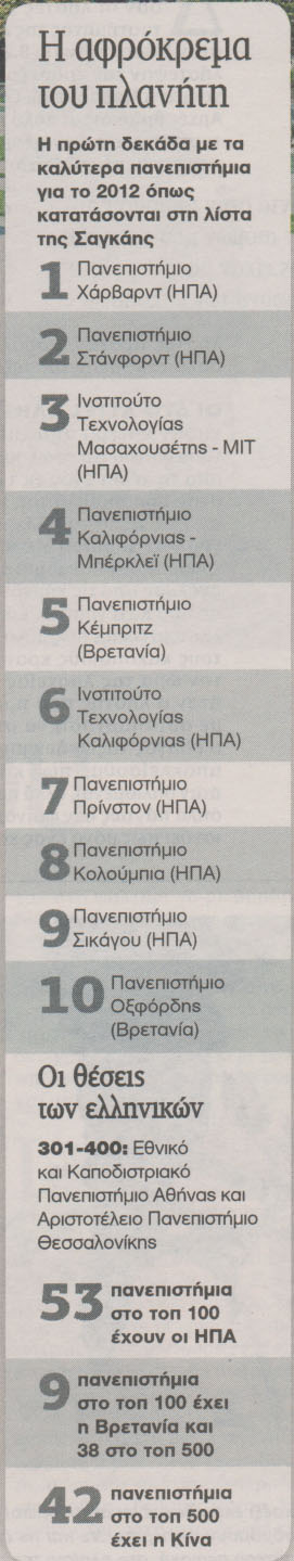 Μακριά από την πρώτη εκατοντάδα με τα καλύτερα πανεπιστήμια του κόσμου, όπως αξιολογούνται στη λεγόμενη λίστα της Σαγκάης, παραμένουν τα ελληνικά ανώτατα εκπαιδευτικά ιδρύματα.Το Εθνικό και Καποδιστριακό Πανεπιστήμιο Αθηνών και το Αριστοτέλειο Πανεπιστήμιο Θεσσαλονίκης για ακόμη μία χρονιά συμπεριλαμβάνονται στη λίστα της Σαγκάης που δημοσιεύτηκε χθες, ωστόσο κατατάσσονται στις θέσεις 301- 400. Μάλιστα, το Καποδιστριακό φέτος τα πήγε χειρότερα: στη λίστα του 2011 ήταν στις θέσεις 201-300.Σ’ αυτές τις κατηγορίες πάντως μετά τα πρώτα 100 πανεπιστήμια δεν υπάρχει αύξων αριθμός για τα ιδρύματα αλλά αναφέρονται με αλφαβητική σειρά.Η λίστα περιλαμβάνει τα αποτελέσματα αξιολόγησης 500 πανεπιστημίων απ’ όλο τον κόσμο. Και μπορεί μεν τα ελληνικά ιδρύματα να παραμένουν σταθερά μακριά από τις πρώτες θέσεις, αλλά τα αμερικανικά αναδεικνύονται και πάλι πρωταθλητές καταλαμβάνοντας τις 17 από τις πρώτες 20 θέσεις. Στην κορυφή της λίστας βρίσκεται ξανά το Χάρβαρντ, στη δεύτερη θέση το Στάνφορντ και στην τρίτη το ΜΙΤ, το Ινστιτούτο Τεχνολογίας της Μασαχουσέτης.Μόλις δύο πανεπιστήμια από άλλες χώρες συμπληρώνουν την πρώτη δεκάδα. Πρόκειται για τα βρετανικά πανεπιστήμια του Κέμπριτζ που κατατάσσεται στην 5η θέση και της Οξφόρδης στη 10η. Σημειώνεται ότι το τοπ-10 παρέμεινε ακριβώς ίδιο όπως και το 2011. Οσο για την 20άδα, περιλαμβάνει μόλις ένα πανεπιστήμιο εκτός ΗΠΑ, αυτό του Τόκιο στην 20ή θέση.Στη φετινή λίστα, για πρώτη φορά η Κίνα έχει περισσότερα πανεπιστήμια (42) σε σύγκριση με τη Βρετανία (38). Με τη διαφορά όμως ότι στο τοπ-100 δεν περιλαμβάνεται κανένα κινεζικό πανεπιστήμιο.