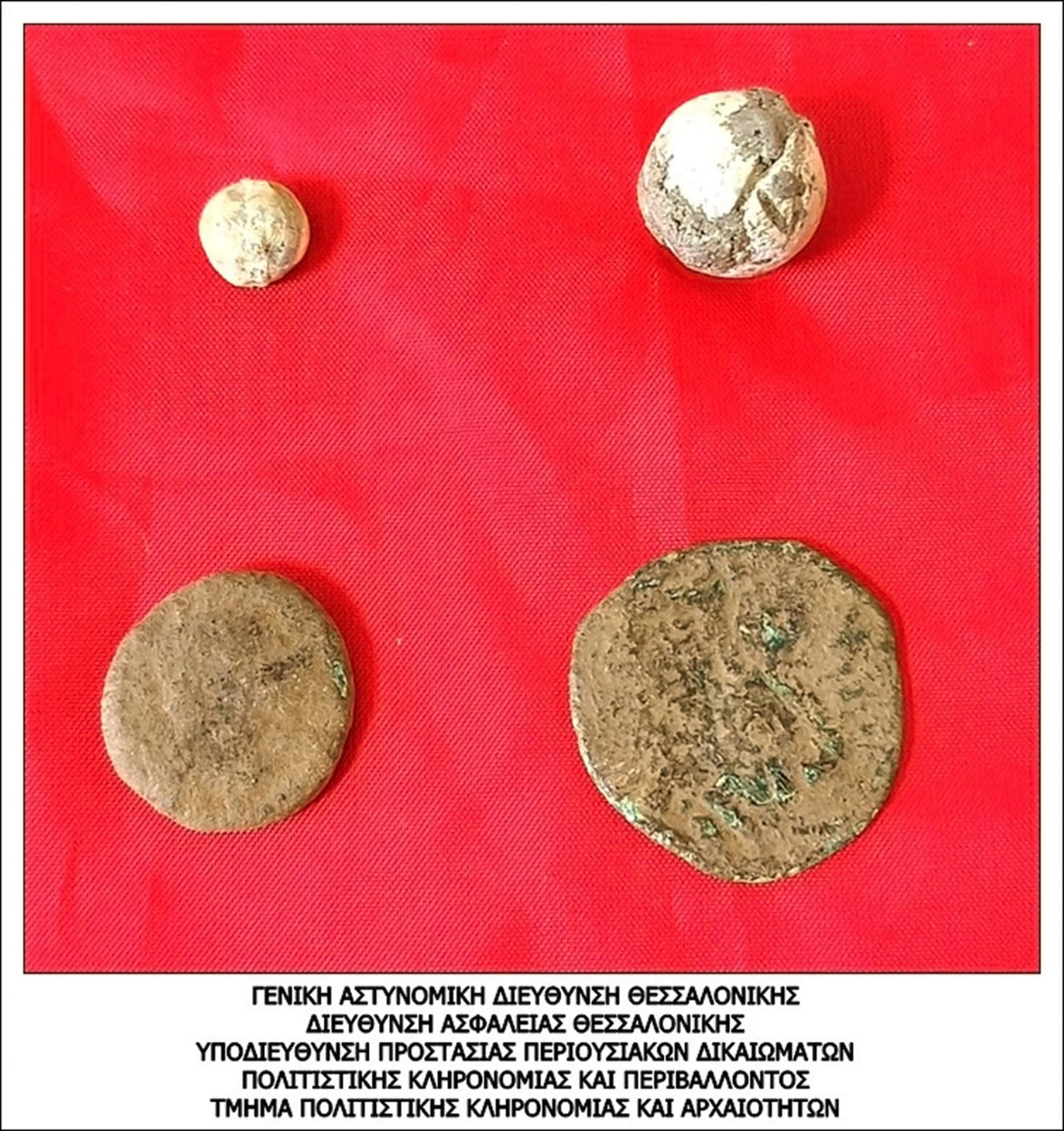 Έπειτα από έρευνες που ακολούθησαν βρέθηκαν τόσο στην κατοχή του όσο και στο σπίτι του δύο μολύβδινα αντικείμενα και δύο αρχαία ρωμαϊκά νομίσματα, τα οποία εξετάστηκαν από αρχαιολόγο της Εφορείας Αρχαιοτήτων Σερρών και διαπιστώθηκε ότι εμπίπτουν στις διατάξεις του νόμου για την προστασία των αρχαιοτήτων και εν γένει της πολιτιστικής κληρονομιάς.