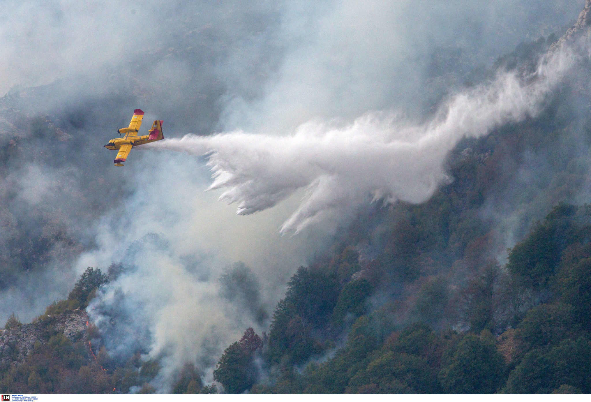 Από αέρος πραγματοποιούν ρίψεις νερού ένα αεροσκάφος και έξι ελικόπτερα.