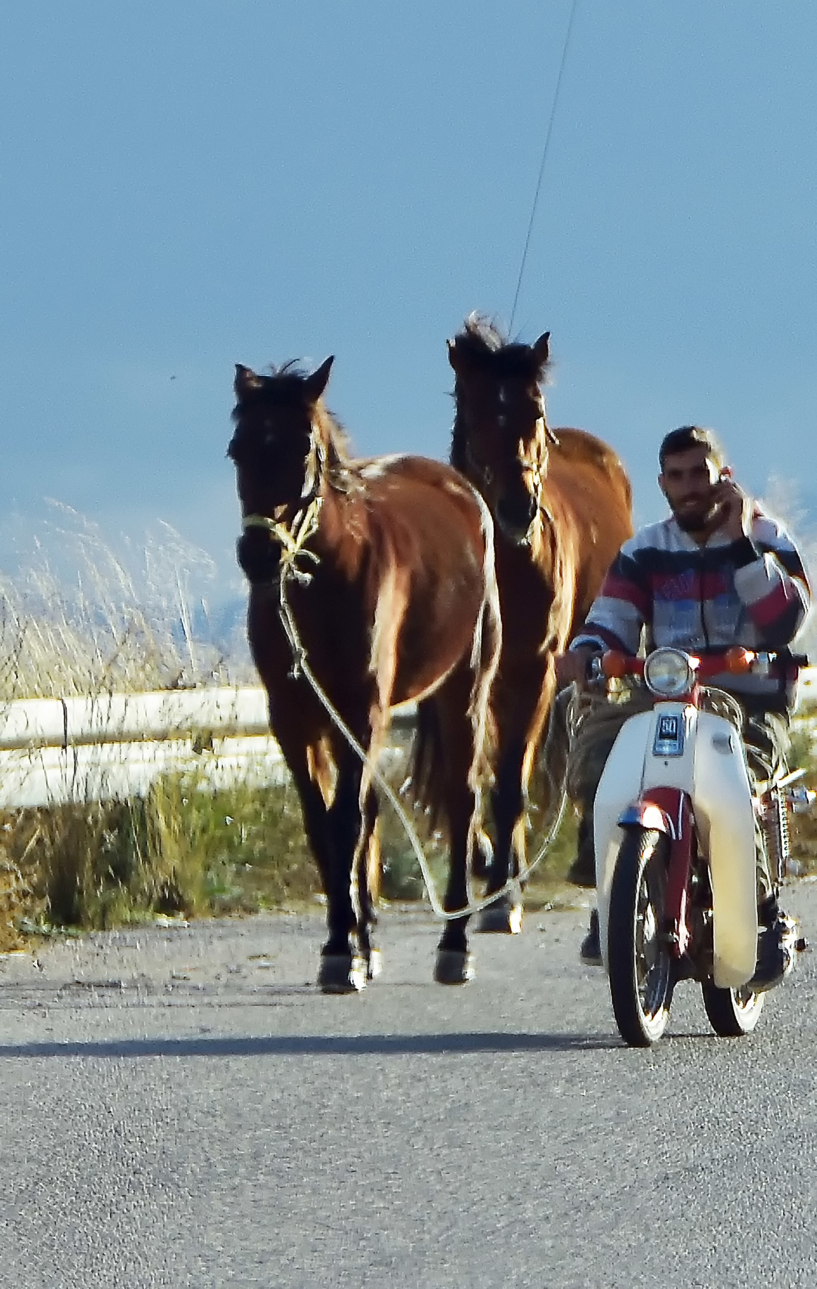 Στη φωτογραφία βλέπουμε έναν πολίτη σε ένα μηχανάκι και με το ένα χέρι να μιλάει στο τηλέφωνο, ενώ ταυτόχρονα βγάζει… βόλτα δύο άλογα.
