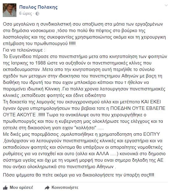 Τι αναφέρει η ανάρτηση Πολάκη στο FacebookΣτην ΠΟΕΔΗΝ απάντησε μέσω Facebook και ο αναπληρωτής υπουργός Υγείας Παύλος Πολάκης αναφορικά με το αν το «Ευγενίδειο», όπου νοσηλεύτηκε ο Πρωθυπουργός, είναι ιδιωτικό ή δημόσιο θεραπευτήριο.