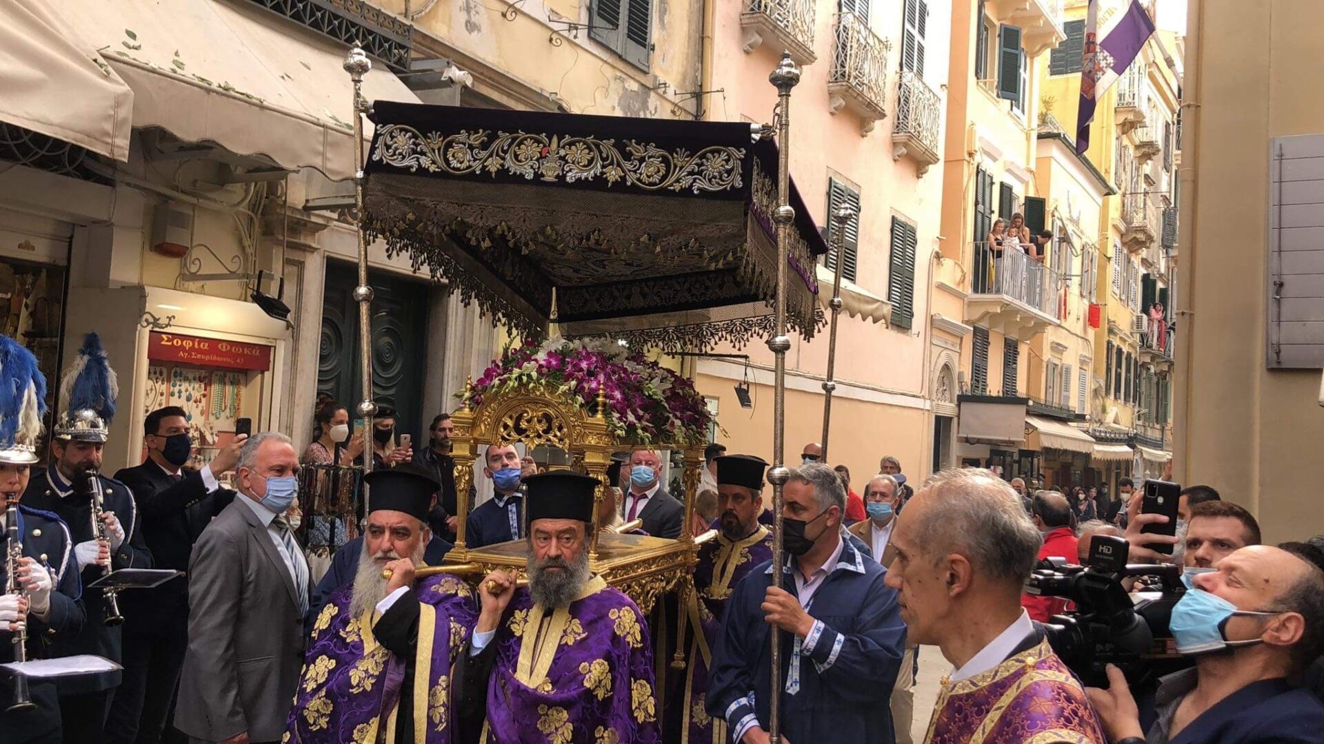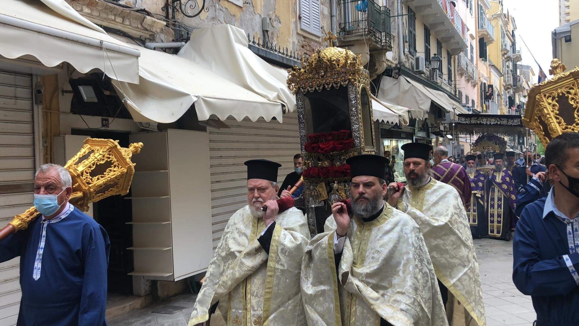Νωρίτερα, το πρωί του Μεγάλου Σαββάτου η Κέρκυρα «σείστηκε» από ένα «μεγάλο σεισμό», καθώς στις 6 το πρωί στον Ιερό Ναό της Παναγίας των Ξένων, αναβίωσε το έθιμο του τεχνητού σεισμού που προκαλείται με θόρυβο, από το κούνημα όλων των εικόνων και των καντηλιών. Ακολούθησε η περιφορά του Επιταφίου της εκκλησίας του Αγίου Σπυρίδωνος μαζί με το Σεπτό Σκήνωμα του Αγίου, στο προαύλιο του Αγίου Σπυρίδωνα. Το έθιμο ακολουθείται πιστά από το 1574 όπου καθιερώθηκε σε ανάμνηση του θαύματος του Αγίου, που έσωσε τον κερκυραϊκό λαό από τη σιτοδεία.