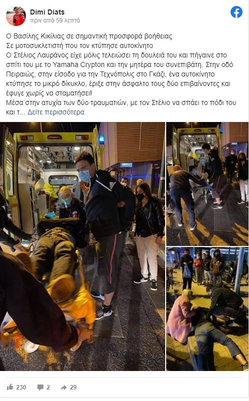 Σύμφωνα με ανάρτηση ενός αυτόπτη μάρτυρα στον λογαριασμό του στο Facebook, ο Βασίλης Κικίλιας έσπευσε να προσφέρει βοήθεια τόσο στον οδηγό της μοτοσυκλέτας, όσο και στη μητέρα του, που ήταν και η συνοδηγός.