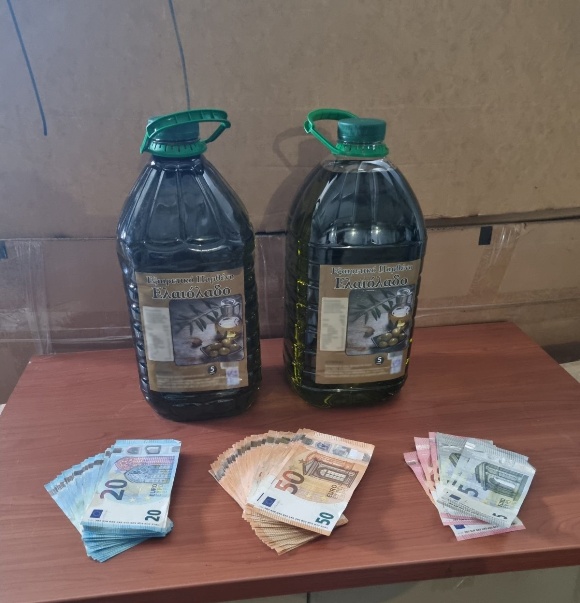 Στη κατοχή του βρέθηκε και κατασχέθηκε το χρηματικό ποσό των 1.550 ευρώ, το οποίο αποδόθηκε στους παθόντες. Τα ανωτέρω δοχεία με λάδι κατασχέθηκαν. Επίσης, κατασχέθηκε το όχημα που οδηγούσε.