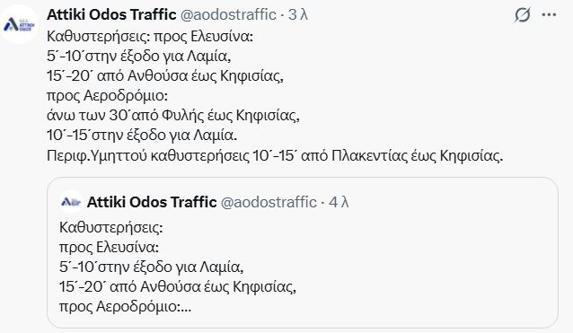 Παράλληλα, καθυστερήσεις καταγράφονται και στη λεωφόρο Αθηνών, από το Χαϊδάρι έως τον Σκαραμαγκά, καθώς και στην παραλιακή στο ύψος του Αλίμου, αλλά και στους δρόμους γύρω από το λιμάνι του Πειραιά.