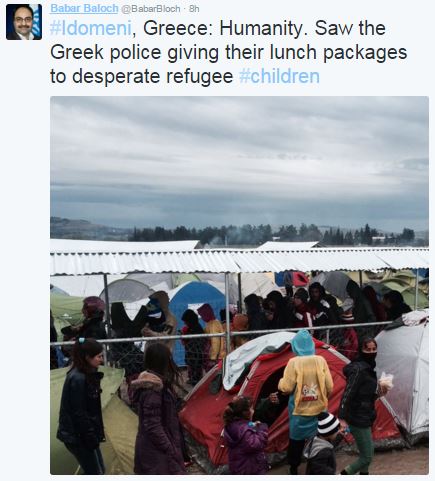 “Ελλάδα: ανθρωπιά. Είδα Έλληνες αστυνομικούς να δίνουν το μεσημεριανό τους στα παιδιά απελπισμένων προσφύγων” έγραψε ο κ. Baloch ανεβάζοντας μια φωτογραφία από τον καταυλισμό.