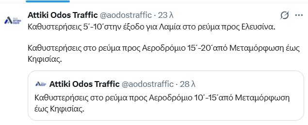Παράλληλα, καθυστερήσεις καταγράφονται και στη λεωφόρο Αθηνών, από το Χαϊδάρι έως τον Σκαραμαγκά, καθώς και στην παραλιακή στο ύψος του Αλίμου, αλλά και στους δρόμους γύρω από το λιμάνι του Πειραιά.