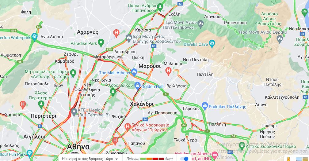 10΄-15΄ από κόμβο Μεταμόρφωσης έως κόμβο Κηφισίας.