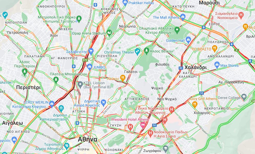 Μποτιλιάρισμα παρατηρείται στη λεωφόρο Κηφισίας ειδικά στο ύψος του Χαλανδρίου, του Ψυχικού και του Αμαρουσίου. Παρόμοια η εικόνα και στη λεωφόρο Μεσογείων στο ύψος του Χολαργού.
