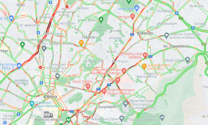 Αυξημένη κίνηση υπάρχει και στην Αλεξάνδρας, στην Μεσογείων, στην Κατεχάκη και στην Λεωφόρο Κηφισίας.
