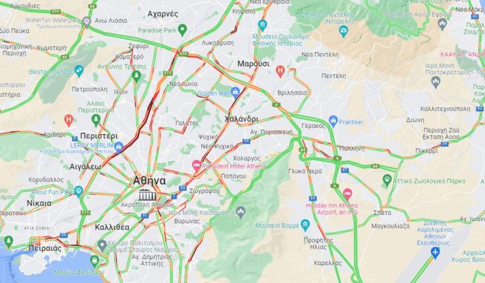 Στο «κόκκινο» βρίσκονται και η Λεωφόρος Μεσογείων, τα δύο ρεύματα της Λεωφόρου Κηφισίας, η Βασιλέως Κωνσταντίνου και η Περιφερειακή Καρέα.