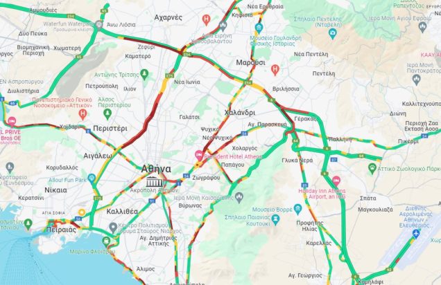 Καθυστερήσεις στο ρεύμα προς Αεροδρόμιο άνω των 30΄από τον κόμβο Αιγάλεω μέχρι τον κόμβο Κηφισίας. Καθυστερήσεις 10΄-15΄στο ρεύμα προς Ελευσίνα από τον κόμβο Πλακεντίας μέχρι τον κόμβο Κηφισίας.