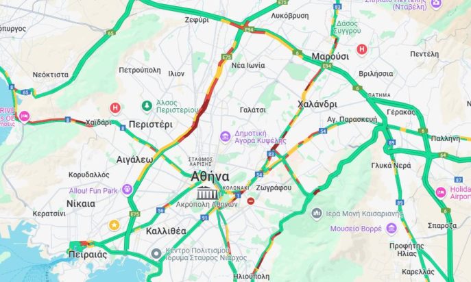 Χαμηλές ταχύτητες καταγράφονται στην κάθοδο της Μεσογείων, στην Αλεξάνδρας, στην Κατεχάκη (στο ρεύμα από Ηλιούπολη), αλλά και στην Λεωφόρο Κηφισίας από το Μαρούσι μέχρι το Ψυχικό.