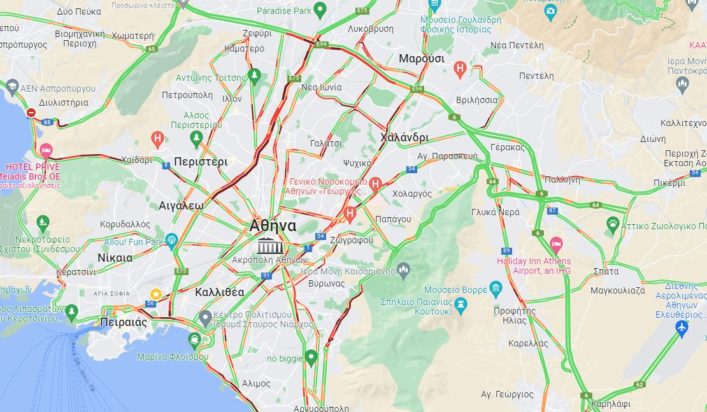 Δύσκολη είναι η κατάσταση και στα δύο ρεύματα της Λεωφόρου Κηφισίας, στην άνοδο της Βασιλίσσης Σοφίας, στην άνοδο της Βασιλέως Κωνσταντίνου, στην Σταδίου, στην Βασιλίσσης Αμαλίας και στους δρόμους γύρω από το λιμάνι του Πειραιά.