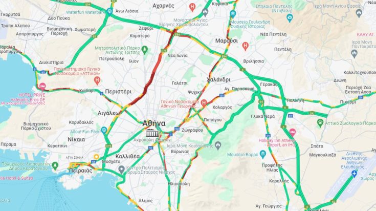 «Κοκκινίζει» ο χάρτης της κίνησης και στην έξοδο της Εθνικής Οδού Αθηνών – Λαμίας από τη γέφυρα Ροσινιόλ μέχρι την Αχαρνών. Τμηματικά πυκνή ροή υπάρχει και στην κάθοδο του Κηφισού.