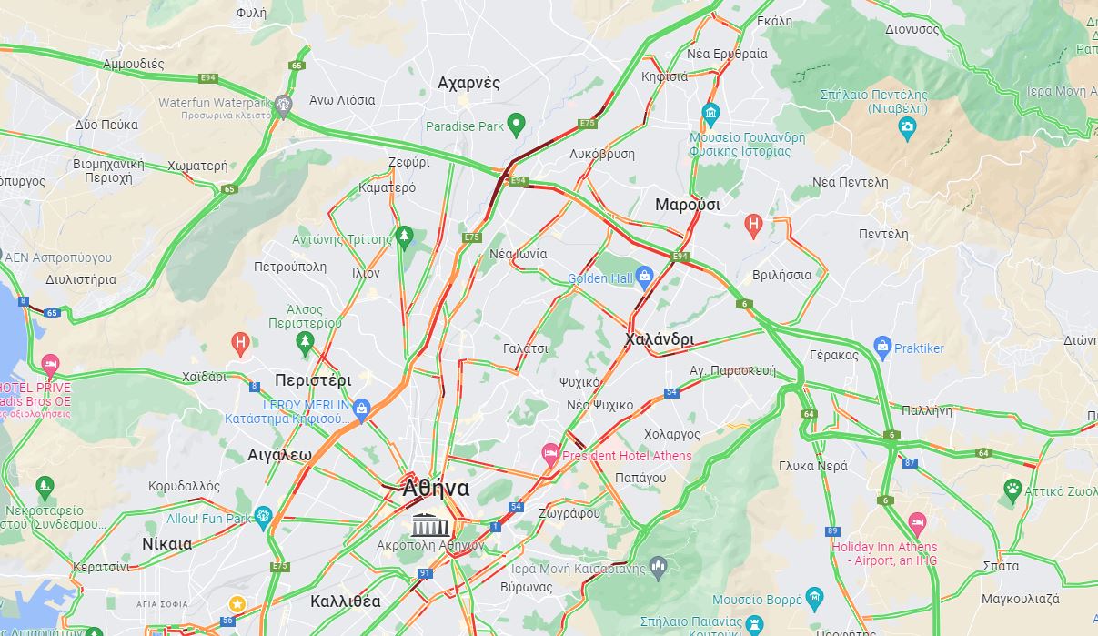 Προβλήματα αντιμετωπίζουν οι οδηγοί που κινούνται στην Αθηνών-Λαμίας (Αθηνών έως κόμβος Καλυφτάκη -έξοδος, από τα ΚΤΕΛ έως την Αχαρνών), στην Αθηνών-Λαμίας (κόμβος Καλυφτάκη έως Αθηνών-είσοδος, από την Κηφισιά έως τη Ν. Φιλαδέλφεια) και την άνοδο του Κηφισού.