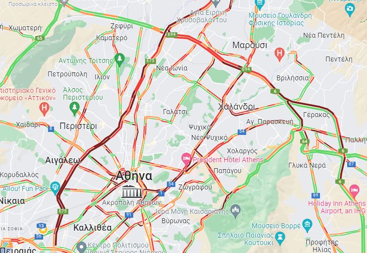 Παράλληλα, στο «κόκκινο» είναι και η Λεωφόρος Κηφισίας τόσο στο ρεύμα ανόδου όσο και στο ρεύμα καθόδου, ενώ την ίδια στιγμή το αδιαχώρητο επικρατεί στις βασικές οδικές αρτηρίες στο κέντρο της Αθήνας.